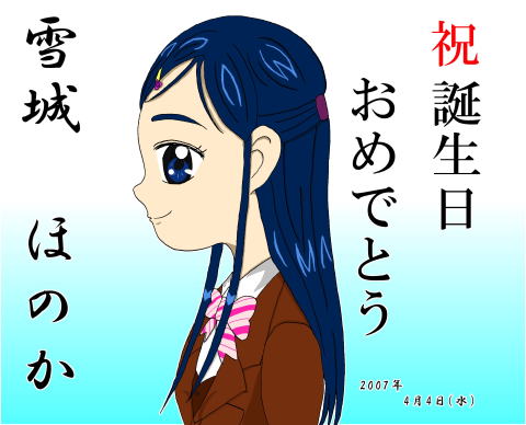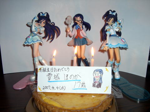 今日は4月4日、 「雪城ほのかの誕生日」です。 とりあえず、日付が変わったので、記念絵を上げておきますね。 年に一度の記念日、誕生日おめでとうほのか!! えっと、今年で17歳ですかね? 今年もケーキ買って来ました。 ほのかも華の高校二年生ですかね。 またいつしかテレビでほのかに会えたら嬉しいな、 と、よく思います。